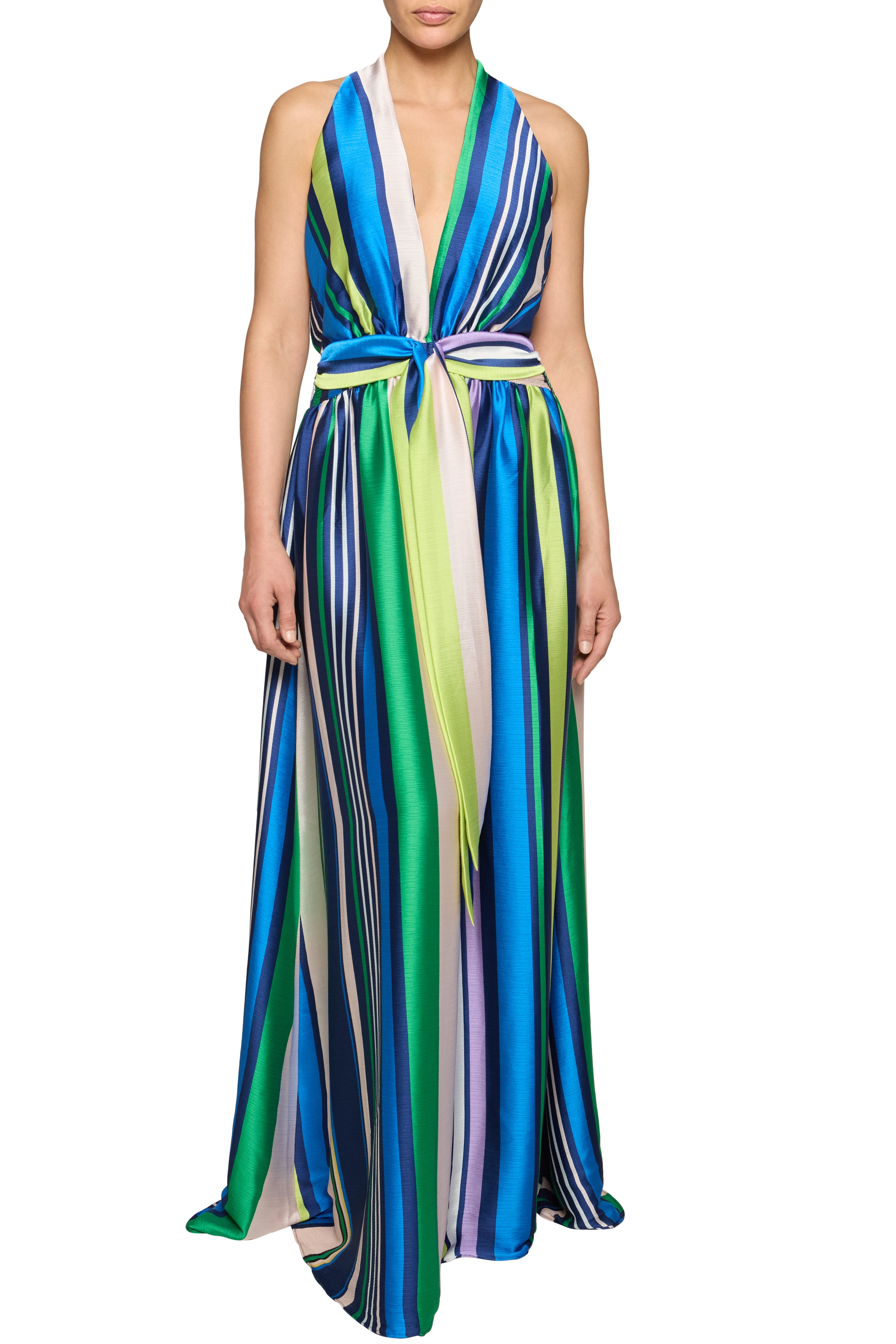 The Kamil makes an instant statement with a plunging v-neck in bold stripes. The sleeveless silhouette with a smocked elastic back waist and tie detail keeps the fit flattering for poolside lunches, resort dinners, or beach clubs where you want to turn heads.