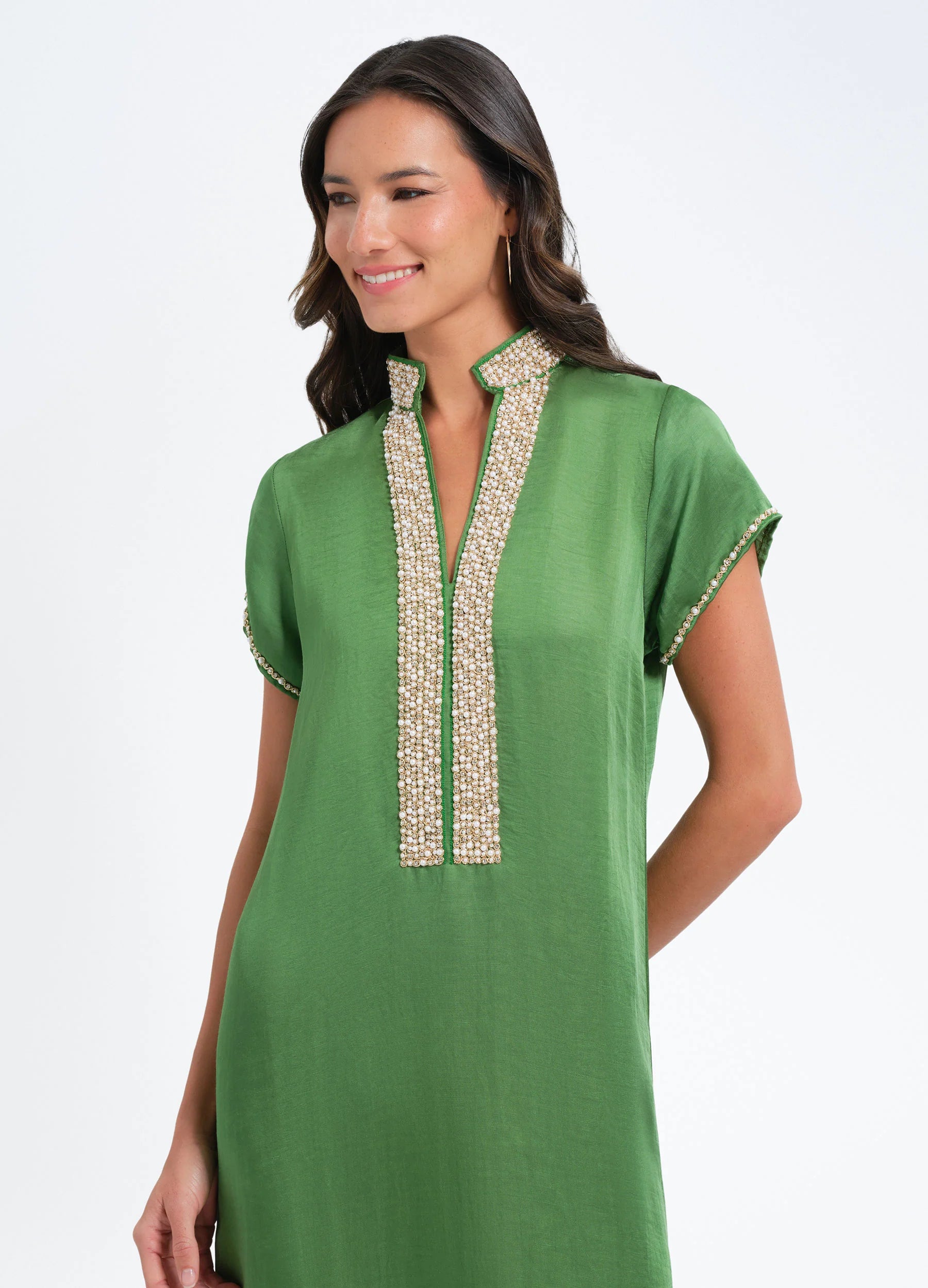 The Pearl cap sleeve caftan combines the classic beauty of pearls and gold hand beading on the neckline of this classic style. We love the cap sleeve caftan for special occasion dressing or at home entertaining. The silky linen/viscose fabric is in green. The flattering stand collar, cap sleeves and side slits add ease to this elegant style.