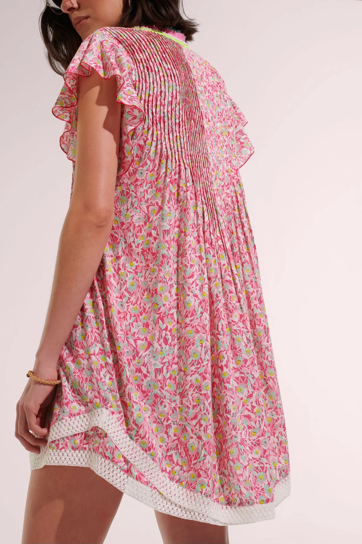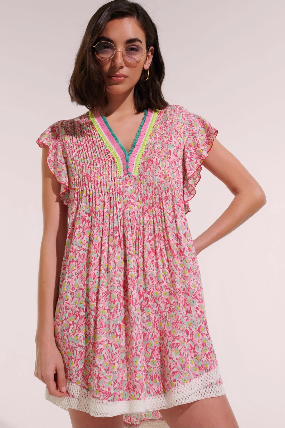 Mini Dress Sasha is a Poupette St Barth classic with a vibrant fringed collar, flutter sleeves and lace trim at the hem. Its trapeze shape can be adjusted with a belt for a refined look. Ideal for a casual and cool beach style.