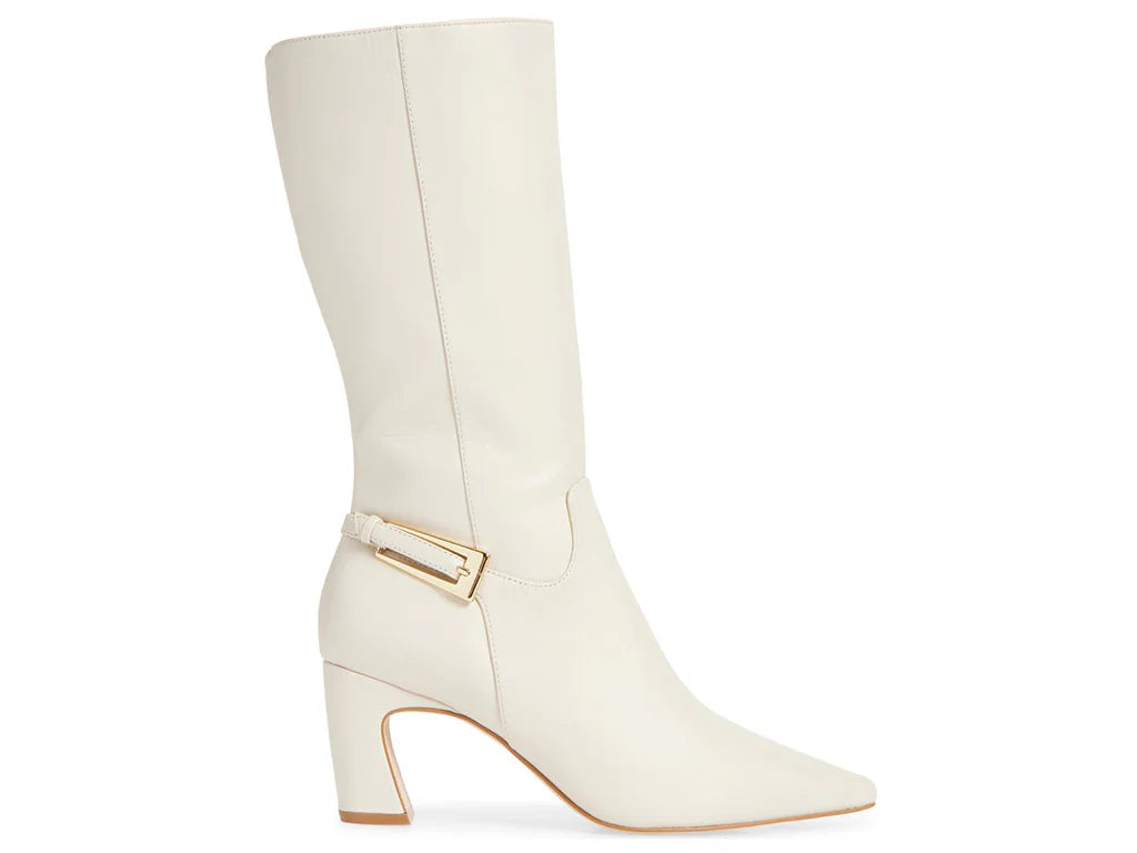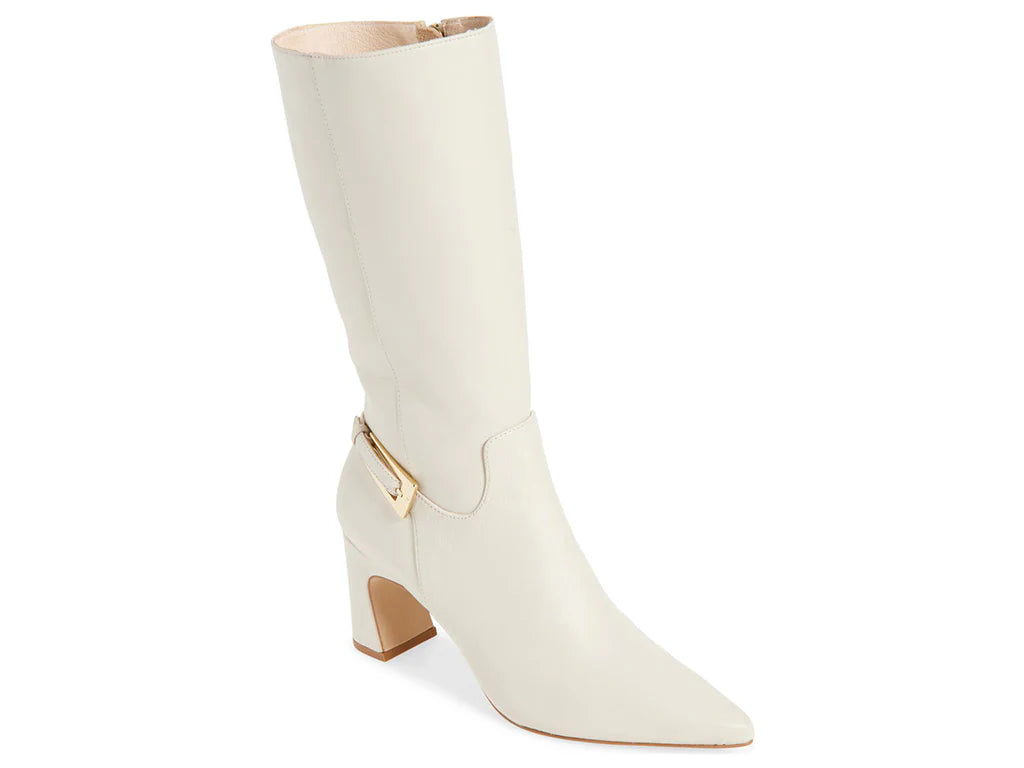 This leather boot, crafted in Brazil, features a mid-height silhouette with a sharp pointy toe and a flared heel, complemented by a cushioned footbed for added comfort.